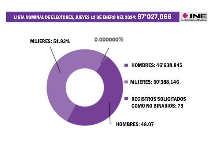 Hasta el corte del jueves 11 de enero del 2024 había 97 millones 27 mil 66 ciudadanos inscritos en la Lista Nominal de Electores del país, personas que ya tienen su credencial para votar el domingo 2 de junio del 2024. El 51.93 por ciento son mujeres y el 48.07 son varones.