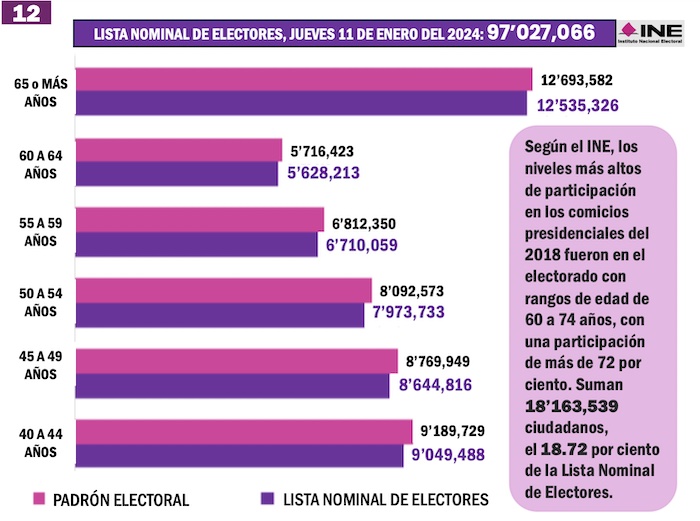 Según el INE, los niveles más altos de participación en los comicios presidenciales del 2018 fueron en el electorado con rangos de edad de 60 a 74 años, con una participación de más de 72 por ciento. Ese segmento de potenciales votantes suman en la actual Lista Nominal de Electores 18 millones 163 mil 539 ciudadanos, el 18.72 por ciento.