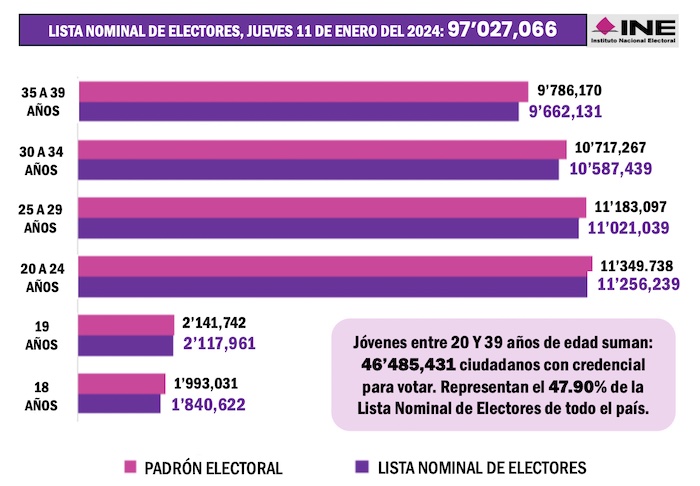 En tanto que el segmento de jóvenes entre 20 Y 39 años de edad suma 46 millones 485 mil 431 ciudadanos con credencial para votar, que representan el 47.90 por ciento de la Lista Nominal de Electores de todo el país. Aunque este es el segmento poblacional más numeroso, es también elo que menos acude a las urnas y registra los más altos índices de abstencionismo.