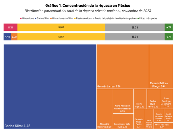 Lo anterior ha permitido que la riqueza se concentre en 14 mexicanos ultrarricos y sus familias, que tienen un valor combinado de casi 180 mil millones de dólares. De acuerdo con una gráfica de Oxfam México, a noviembre de 2023 Carlos Slim por sí sólo concentraba 4.48 por ciento de la riqueza que existe en México.