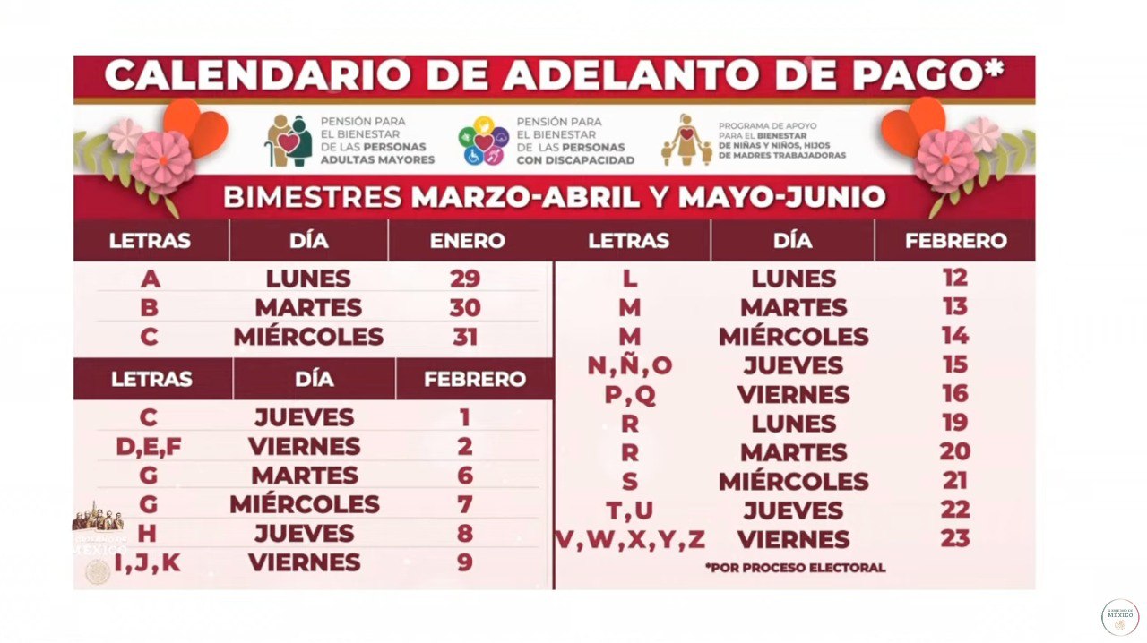 Asimismo, Montiel Reyes detalló que los pagos se realizarán del 29 de enero al 23 de febrero debido a los próximos comicios. Dicho de otro modo, se adelantarán los pagos de los bimestres: marzo-abril y mayo-junio.