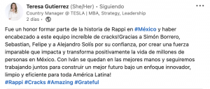 “Fue un honor formar parte de la historia de Rappi en México y haber encabezado a este equipo increíble de cracks! Gracias a Simón Borrero, Sebastian, Felipe y a Alejandro Solís por su confianza, por crear una fuerza imparable que impacta y transforma positivamente la vida de millones de personas en México”, confirmó en LinkedIn tras su fichaje con Tesla.
