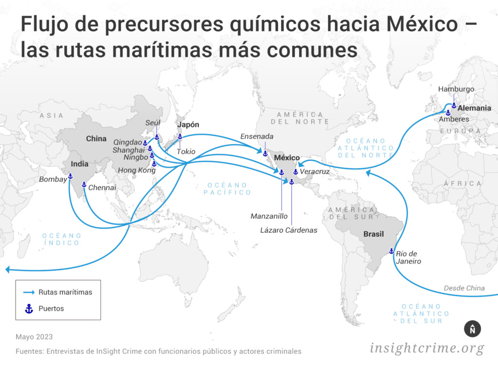 A lo largo de esta administración, el Gobierno federal ha identificado que ingredientes químicos arriban vía marítima a los puertos de Lázaro Cárdenas, en Michoacán; Mazatlán en Sinaloa, y Manzanillo en Colima desde Asia, particularmente desde China.