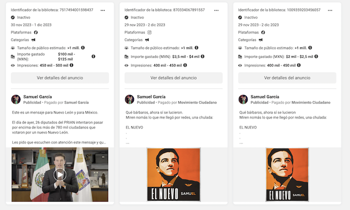 Sólo en las cuentas de Facebook e Instagram de Samuel García, MC y el político pagaron 346 anuncios del 20 de noviembre al 2 de diciembre —el día que el Gobernador anunció su permanencia en el cargo— que costaron entre 1 millón 660 mil 200 pesos y 2 millones 055 mil 854 pesos, de acuerdo con el rango de precios de la Biblioteca de Anuncios de Meta, donde se identifica un “límite bajo” y un “límite alto” del monto pagado por publicaciones.