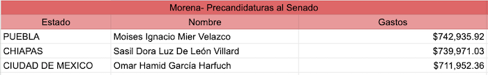 Además, la legisladora Sasil de León en Chiapas, el exsecretario de Seguridad Omar García Harfuch en la Ciudad de México, y el Diputado de Puebla Ignacio Mier, quienes compitieron en la encuesta de Morena por gubernaturas pero no fueron designados por el partido, fueron los únicos perfiles con precampañas al Senado de más de 700 mil pesos.