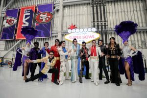 Imitadores y coristas de Elvis Presley, incondicionales de Las Vegas, dieron la bienvenida a los 49ers de San Francisco y a los Chiefs de Kansas City cuando llegaron el fin de semana pasado. Una imponente réplica del Trofeo Vince Lombardi flota en las fuentes del Bellagio. Imitaciones de postes de gol de campo apuntalan los puentes peatonales en el boulevard Las Vegas, mejor conocido como “Strip” —la franja donde se encuentran los principales hoteles, casinos y centros comerciales.