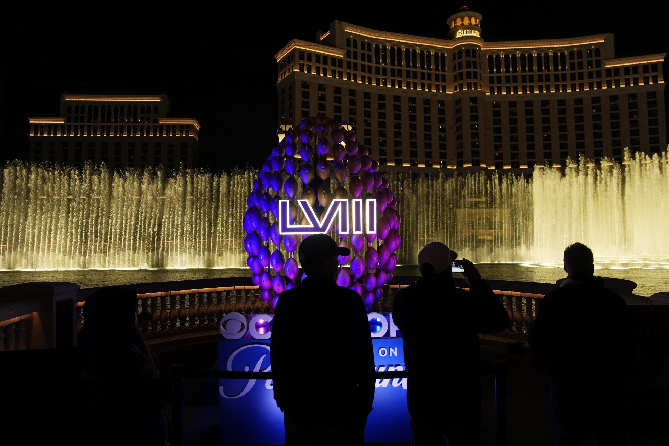 El logo del Super Bowl frente a la fuente del Bellagio en el Strip de Las Vegas. Foto: John Locher, AP.