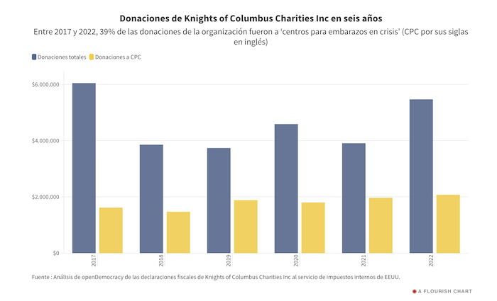 Casi 40 por ciento de todas las donaciones de Knights of Columbus Charities Inc en el periodo analizado fueron a CPC. El resto del dinero fue a iglesias, “compra y distribución de sillas de ruedas para los necesitados”, “ayuda en caso de desastres”, “asistencia a cristianos perseguidos”, “esfuerzos contra la trata de personas”, “alimentos para los necesitados”, “alivio para el COVID-19”, “apoyo para el desarrollo de seminaristas”, “fondo de solidaridad con Ucrania”, “operaciones generales” y al “Programa de cultura de la vida”, que también incluye actividades antiaborto.