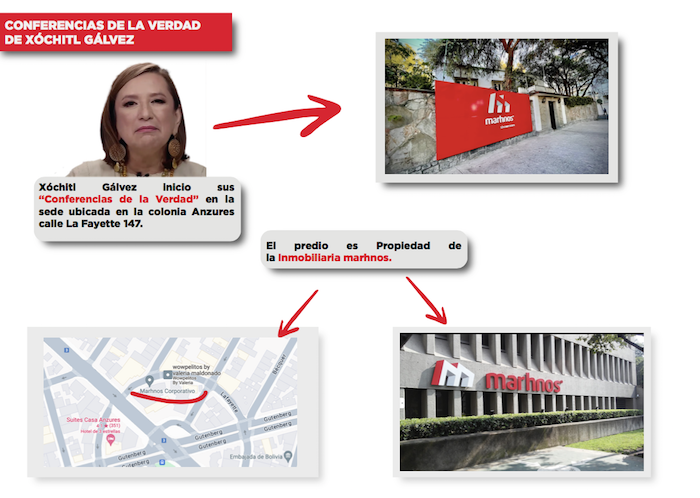 La Inmobiliaria Marhnos edificó un complejo en Miguel Hidalgo en el año 2017 en la Colonia Granada de 3 torres y más de 360 departamentos, el cual Xóchitl Gálvez autorizó. Hoy, en otro predio de su propiedad, se organizan las conferencia de prensa de Xóchitl Gálvez, denunció Morena.