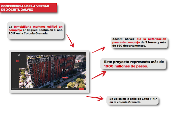 Previamente, Víctor Hugo Romo exhibió que la Inmobiliaria Marhnos —que obtuvo contratos en los Gobiernos de Felipe Calderón Hinojosa y Enrique Peña Nieto— edificó un complejo en Miguel Hidalgo en el año 2017 en la Colonia Granada de 3 torres y más de 360 departamentos, el cual Xóchitl Gálvez autorizó.