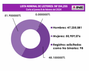 Desde 1980 las mujeres son mayoría en nuestro país, según el Censo Nacional de Población elaborado ese año. Y también son mayoría en la Lista Nominal de Electores de la República, que con corte hasta el pasado jueves 6 de febrero del 2024 tenía registradas 50 millones de mujeres contra 47 millones de varones. En porcentaje femenino representa 51.90 por ciento contra 48.10 de los hombres.