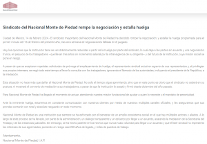 “Esta situación no hace más que dañar al Nacional Monte de Piedad. No sólo el tiempo sigue apremiando, sino que en este punto es obvio que el sindicato no cederá en su postura, ni mostrará el convenio de mediación a sus trabajadores, a pesar de que la Institución lo aceptó y firmó desde diciembre del año pasado”, lamentó el Nacional Monte de Piedad tras el estallamiento a huelga.