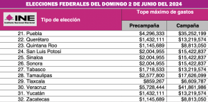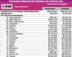 En tanto que para las campañas de senadores el tope de gastos más alto corresponde a Ciudad de México, Jalisco y Estado de México con 44 millones 65 mil 248 pesos pora cada candidato en cada una de esas tres entidades. Las campañas para senadores de más bajo tope de gastos campaña son las de Baja California Sur, Campeche y Colima, con un monto de 4 millones 406 mil 525 pesos.