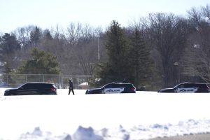 Esta fotografía muestra vehículos policiales luego que dos policías y un socorrista fueron muertos a tiros el domingo 18 de febrero de 2024, en Burnsville, Minnesota. (Foto AP/Abbie Parr)