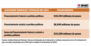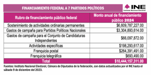 Hasta el 15 de febrero del 2024 el Padrón Electoral en México tenía 100 millones 201 mil 209 ciudadanos. Un 33 por ciento de la UMA equivale a $35.82 pesos, que multiplicados por el total del Padrón Electoral representaría un financiamiento para los partidos políticos de 3 mil 589 millones 207 mil 306 pesos, a valores del 2024.