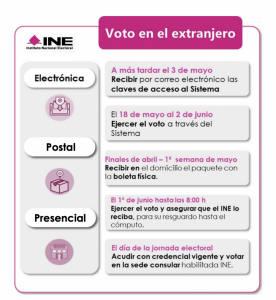 El día de la Jornada Electoral los ciudadanos radicados en el extranjero deberán acudir a alguno de los Módulos Receptores de Votación que el INE habilitará en 23 sedes en el extranjero, y presentar su Credencial para Votar vigente tramitada en el extranjero o en México.