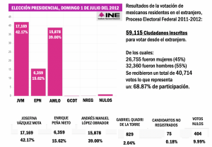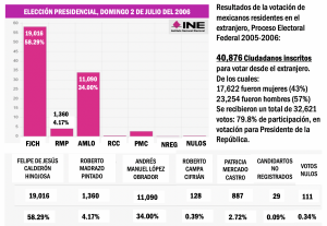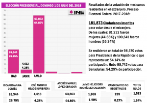 Para el proceso electoral del 1 de julio del 2018 se registraron, para votar desde el extranjero, 181 mil 873 compatriotas. Hoy el Instituto Nacional Electoral (INE) informó que en el último corte de las 9:00 de la mañana, ya habían solicitado su inclusión en la Lista Nominal de Electores en el Extranjero, 201 mil 353 ciudadanos mexicanos que expresaron interés de participar en los comicios del próximo domingo 2 de junio, utilizando alguna de las tres modalidades disponibles: electrónica por internet, por correo postal ordinario o de manera presencial en 23 sedes consulares, 20 en Estados Unidos; una en Montreal, Canadá; otra en Paris, Francia y una más en Madrid, España.