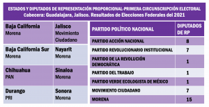 En los comicios del 2021 Morena ganó 27 de 27 distritos electorales en los cinco estados que desde ese año gobierna. En la contienda por los distritos de Mayoría Relativa, Morena le dará una dura pelea a Movimiento Ciudadano en Jalisco, donde en los comicios de hace tres años ganó 7 de 20 demarcaciones. En este 2024 Morena y sus aliados podría triunfar en por lo menos 10 distritos de Mayoría Relativa.