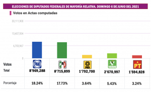 En los comicios del domingo 6 de junio del 2021 PAN-PRI-PRD sumaron 16 diputaciones de Representación Proporcional, con un porcentaje de votos, en conjunto, del 34.08 por ciento; enfrente, Morena y sus aliados sumaron el 39.85 por ciento de los votos, para un total de 17 diputaciones federales plurinominales. Enmedio quedó el partido Movimiento Ciudadano, que logró 7 diputaciones de Representación Proporcional, de las 40 que se disputan en la Primera Circunscripción. Las diputaciones Plurinominales se reparten entre los partidos políticos con base en el porcentaje de votos que logran en la suma de los ocho estados que la integran.