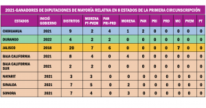 En Durango, gobernado por el PRI, Morena y sus aliados ganaron el 2021 dos de los cuatro distritos electorales de Mayoría en juego, mientras que, en Chihuahua, que está en manos del PAN, Morena y sus socios electorales se llevaron tres de nueve distritos electorales de Mayoría Relativa.