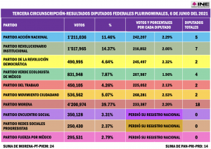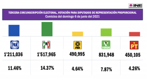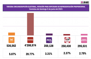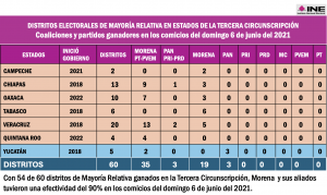 En la contienda por las 60 diputaciones de Mayoría Relativa que estuvieron en juego en la Tercera Circunscripción, en los comicios del domingo 6 de junio del 2021, Morena y sus aliados lograron 54 victorias para una efectividad del 90 por ciento. La coalición PAN-PRI-PRD alcanzó tres diputaciones de Mayoría Relativa y de manera individual, el partido albiazul sumó otras tres en el estado de Yucatán.