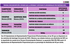 Con 24 diputaciones de Representación Proporcional en los comicios del 2021, de las 40 que estaban en juego, Morena y sus aliados tuvieron un porcentaje de efectividad del 60 por ciento en la Tercera Circunscripción. De aumentar a 29 triunfos en la disputa de las curules plurinominales, Morena llegaría a un porcentaje de efectividad en la región del 72.5 por ciento. En esta Tercera Circunscripción del sureste mexicano el Partido Movimiento Ciudadano sólo alcanzó dos diputaciones de Representación Proporcional.