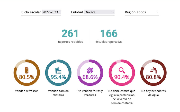 básica". Sin embargo, datos recopilados por la iniciativa Mi Escuela Saludable muestran que 95.4 por ciento de 166 escuelas de Oaxaca analizadas durante ciclo escolar 2022-2023 aún venden comida chatarra.