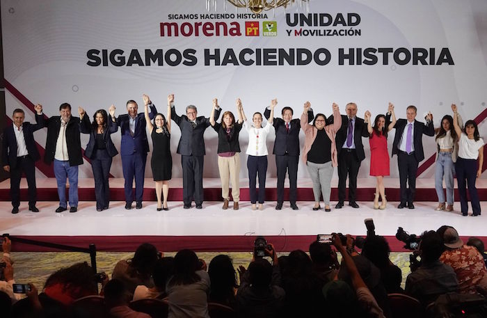 La palabra unidad fue la que más se pronunció en Morena durante su proceso interno. Ésta se reforzó cuando el excanciller, Marcelo Ebrard, acompañó a Sheinbaum en el cierre de precampaña en el Monumento a la Revolución. El mensaje de Ebrard fue claro: Sheinbaum tiene el bastón de mando. Y, pese a todo Claudia Sheinbaum se registró ante el INE, el mismo día que la oposición organizó una concentración para defender la democracia en el Zócalo de la Ciudad de México.