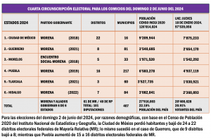 El domingo 2 de junio del 2024, la coalición Morenista podría ganar en la Cuarta Circunscripción 52 de 61 distritos electorales federales de Mayoría Relativa, para un porcentaje de efectividad del 82.53%. La oposición podría arrebatarle a Morena y sus aliados, siete diputaciones de Mayoría Relativa en Ciudad de México y dos en el estado de Puebla. En tanto que de las 40 plurinominales en disputa en la Cuarta Circunscripción, PAN-PRI-PRD, además de Movimiento Ciudadano, podrían sumar entre 12 y 15 curules de Representación Proporcional. Para Morena y sus aliados podrían ser entre 25 y 28 plurinominales en esta región.