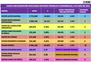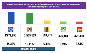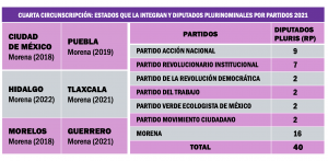 En las elecciones del domingo 6 de junio del 2021 Morena logró 16 diputaciones de Representación Proporcional en la Cuarta Circunscripción, por 9 del Partido Acción Nacional y 7 del Partido Revolucionario Institucional. Porcentualmente, PAN y PRI sumaron un 34.47 por ciento de los votos en la Cuarta Circunscripción Electoral, en tanto que Morena, por su propia cuenta, tuvo un 36 por ciento de votos de respaldo en la región. La situación para Morena mejorará en los comicios del domingo 2 de junio del 2024, pues en los comicios del 2021 ganó las gubernaturas de Guerrero y Tlaxcala, mientras que en 2022 se quedó con la victoria en Hidalgo, para dominar completamente la Cuarta Circunscripción Electoral.