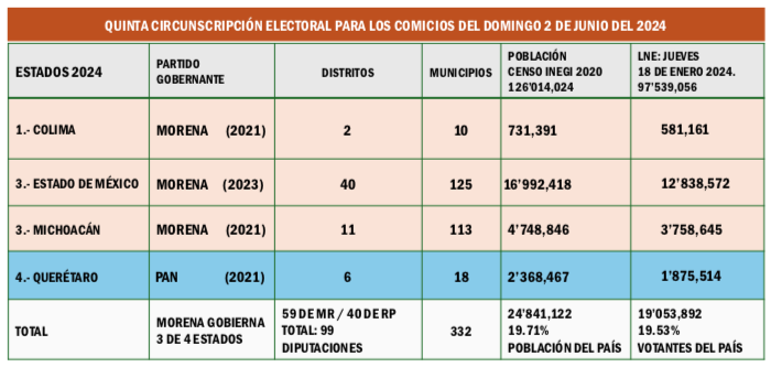 En la Quinta Circunscripción Electoral, Morena gobierna tres de cuatro entidades federativas, incluyendo la más fuerte y poderosa del país, que es Estado de México, además de Michoacán y Colima. Por su parte el PAN administra el estado de Querétaro.