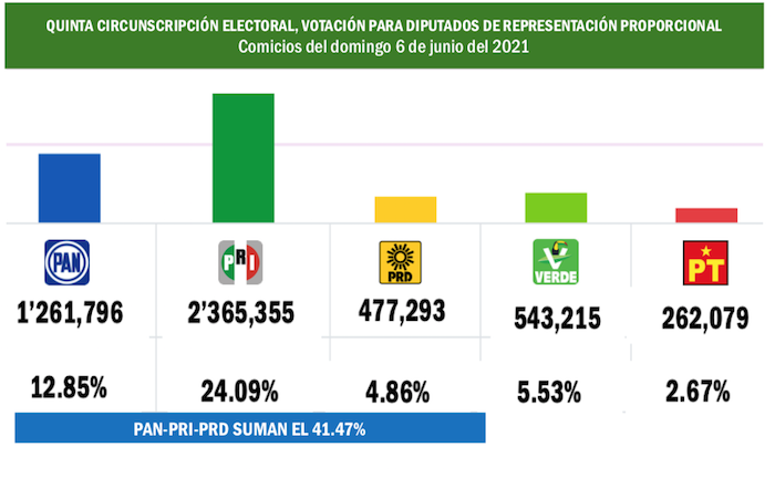 Morena, por su parte, logró en el 2021 un total de 16 diputaciones de Representación Proporcional en esta Quinta Circunscripción Electoral, pero si en los próximos comicios rebasa en la región un porcentaje de votación superior al 50 por ciento, podría aspirar a obtener hasta 22 legisladores plurinominales.