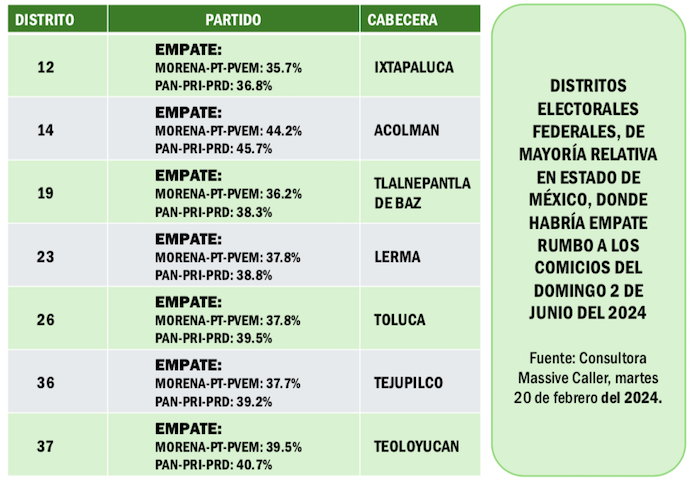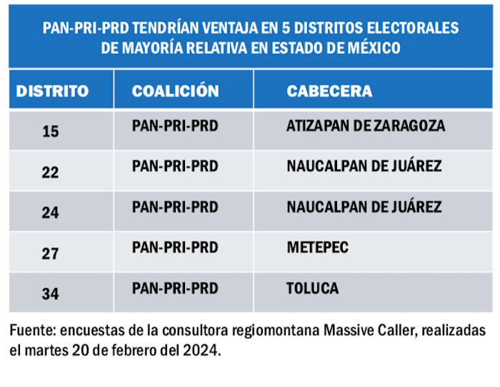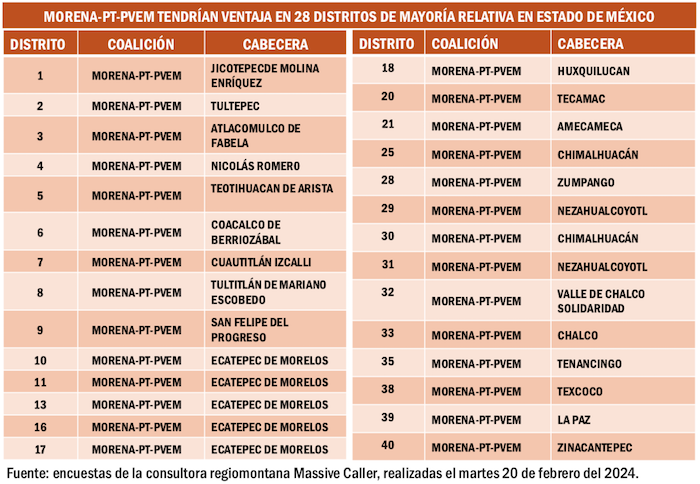 El futuro inmediato no es muy prometedor para la coalición Fuerza y Corazón por México, pues una exploración estadística que realizó el pasado martes 20 de febrero del 2024 la consultora regiomontana Massive Caller, reflejó que, en el Estado de México, Morena y sus aliados tenía la delantera en 28 de los 40 distritos electorales federales de Mayoría Relativa que estarán en disputa.