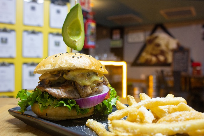 ¿Qué comer? la hamburguesa Chilanga es icónica del lugar, esta se prepara con doble porción de carne de res, guacamole, tocino y mucho queso en un pan artesanal, otra opción es el Hotdog Tabasco que lleva plátano macho con curry, pero si lo que prefieres es algo más ligero el aguachile es opción o si lo que se busca es algo estilo botana, las papas con parmesano acompañaran muy bien la cerveza -como Música Ligera-.