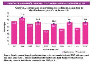 El promedio de participación en los cuatro más recientes procesos electorales es del 62.27 por ciento. Sobre una lista nominal de electores de 99’023,975 ciudanos, con corte al reciente jueves 29 de febrero del 2024, podríamos calcular que acudirían a las urnas, el próximo domingo 2 de junio del 2024, un total de 61’662,229 personas.