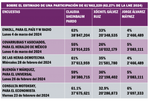 En su mejor desempeño, hasta ahora, su rival de la coalición Fuerza y Corazón por México, PRI-PAN-PRD, la senadora panistas Xóchitl Gálvez Ruiz, podría alcanzar, según las más recientes encuestas, hasta 36 por ciento de la votación, que equivaldrían a poco más de 22 millones de sufragios, según concluye el ejercicio demoscópico realizado por la consultora Buendía y Márquez, para el periódico El Universal. Las más recientes encuestas publicadas reflejan que en su desempeño más modesto, el que le atrtibuye la consultora Covarrubias y Asociados, en un ejercicio demoscópico para el Heraldo de México, Gálvez Ruiz podría alcanzar un porcentaje del 26 por ciento, que en sufragios constantes y sonantes reepresentaría más de 16 millomnes de votos.