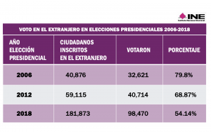 Para los próximos comicios se ha establecida una nueva marca de ciudadanos inscritos para votar desde el extranjero, pues en 2006 sólo hicieron ese trámite 40 mil 876 personas; en 2012 se inscribieron 59 mil 115 mexicanos que radicaban fuera del país y en el 2018 se registraron en la Lista Nominal de Electores fuera de nuestras fronteras 181 mil 873 ciudadanos.