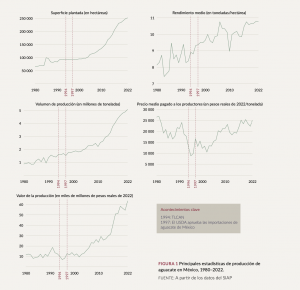 Entre 1994, el primer año en que se firmó el TLCAN, y 2021, la producción de aguacate aumentó un 213 por ciento y su valor un  7 mil 071 por ciento en un mercado que incluía a la Unión Europea desde 2000, cuando entró en vigor el primer Acuerdo de Asociación Económica, Concertación Política y Cooperación UE-México (Acuerdo Global).