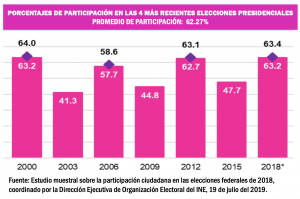 El promedio de participación en las más recientes cuatro elecciones presidenciales, desde que ocurrió al alternancia en nuestro país, entre 2000 y 2018, ha sido del 62.27 por ciento.