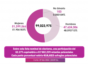 Sobre esa base, podríamos estimar que el domingo 2 de junio del 2024 podrían acudir a las urnas 61 millones 662 mil 229 votantes potenciales, de una Lista Nominal de Electores, que al cierre del pasado 29 de febrero, tenía inscritos 99 millones 23 mil 975 ciudadanos, con credencial de elector vigente.