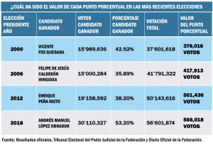 Eso significa que, sobre esa base, podríamos calcular que cada punto porcentual de preferencia, para cualquier candidato, representaría 616 mil 622 votos. Durante los comicios del 2000 cada voto porcentual valió 376 mil 16 sufragios, en tanto que para 2018 el valor de cada punto porcentual aumentó a 566 mil 18 votos.