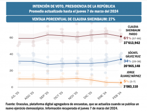 Por otro lado, en la plataforma agregadora de encuesta Oraculos le atribuye a Claudia Sheinbaum un porcentaje de resoaldo del 61 por ciento, que representaría 37 millones 613 mil 942 votos potenciales. Mientras que el porcentaje de respaldo a Xóchitl sería del 34 por ciento, equivalente a 20 millones 965 mil 148 potenciales sufragios.
