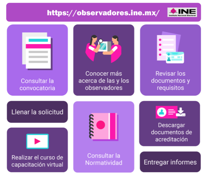 El plazo para el registro de observadores electorales se cumplirá el próximo 7 de mayo. Quienes cumplan los requisitos que exige la Ley serán autorizadas por el Instituto Nacional Electoral para observar los actos de preparación y desarrollo del Proceso Electoral, así como los actos de la jornada electoral, con el propósito de que después presenten un informe de su experiencia al INE.