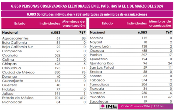 Hasta el pasado 1 de marzo 6 mil 850 ciudadanos habían presentado solicitudes ante el Instituto Nacional Electoral (INE) para realizar esta tarea, de los cuales 6 mil 83 lo hicieron por mérito propio; mientras que las 767 personas restantes solicitaron su inscripción en representación de organizaciones sociales.