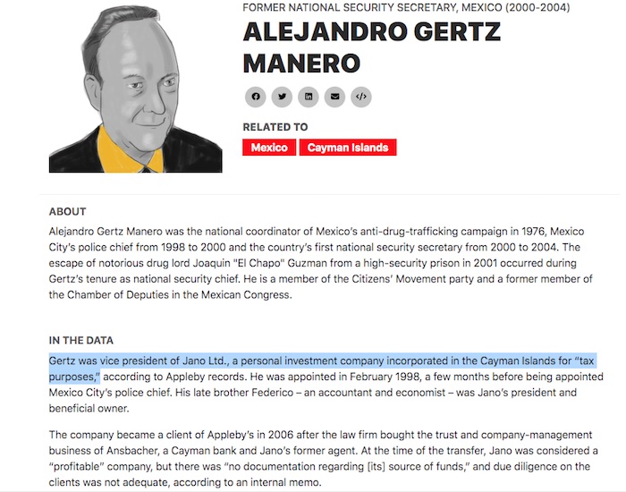 En febrero de 1998, tras apoyar a Cuauhtémoc Cárdenas y apunto de ser el Jefe de la Policía del DF (1998-2000), Alejandro Gertz fue nombrado vicepresidente de Jano Ltd., una empresa constituida en las Islas Caimán para “fines fiscales”, muestra la investigación periodística revelada en 2017 conocida como Paradise Papers.