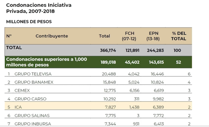 El Presidente Andrés Manuel López Obrador exhibió esta mañana cómo Felipe Calderón condonó 4 mil 42 millones de pesos y Enrique Peña 16 mil 446 millones a Grupo Televisa, mientras que a Grupo Salinas el monto ascendió a 3 mil millones entre 2007 y 2012 y a 7 mil 772 millones de pesos entre 2012 y 2018.