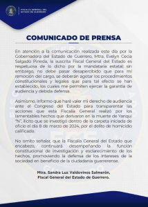 “En atención a la comunicación realizada este día por la gobernadora Evelyn Salgado Pineda, la suscrita fiscal general del estado es respetuosa de lo dicho por la mandataria estatal, sin embargo, no debe pasar desapercibido que para mi remoción del cargo se deberán agotar los procedimientos constitucionales y legales que para tal efecto se han establecido”, expresó en un comunicado la teniente Sandra Luz Valdovinos Salmerón.