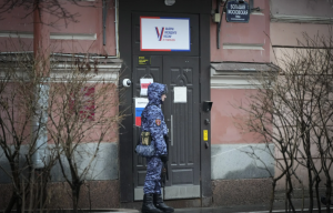 Un militar ruso de la Guardia Nacional custodia un colegio electoral durante las elecciones presidenciales en San Petersburgo, Rusia, el 17 de marzo de 2024. Foto: Thomas Banneyer, dpa vía AP