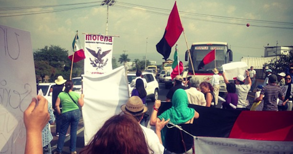 Integrantes del colectivo #YoSoy132, el Sindicato Mexicano de Electricistas, Movimiento Magisterial de Bases y el nuevo partido Movimiento de Regeneración Nacional, realizaron un bloqueo carretero de 15 minutos y marcharon en Morelos contra la toma de protesta del mandatario Enrique Peña Nieto.