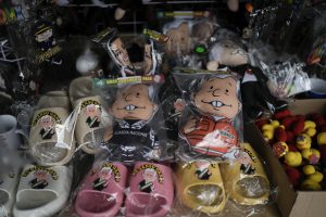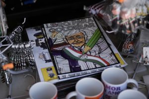 Frente al Palacio presidencial de México, multitudes, principalmente de mexicanos, se agolpan alrededor de un puesto que vende muñecos de felpa, parlantes, aretes, sandalias de plástico, calcomanías, sombreros, tazas, encendedores e incluso libros para colorear con el rostro del muy célebre líder.